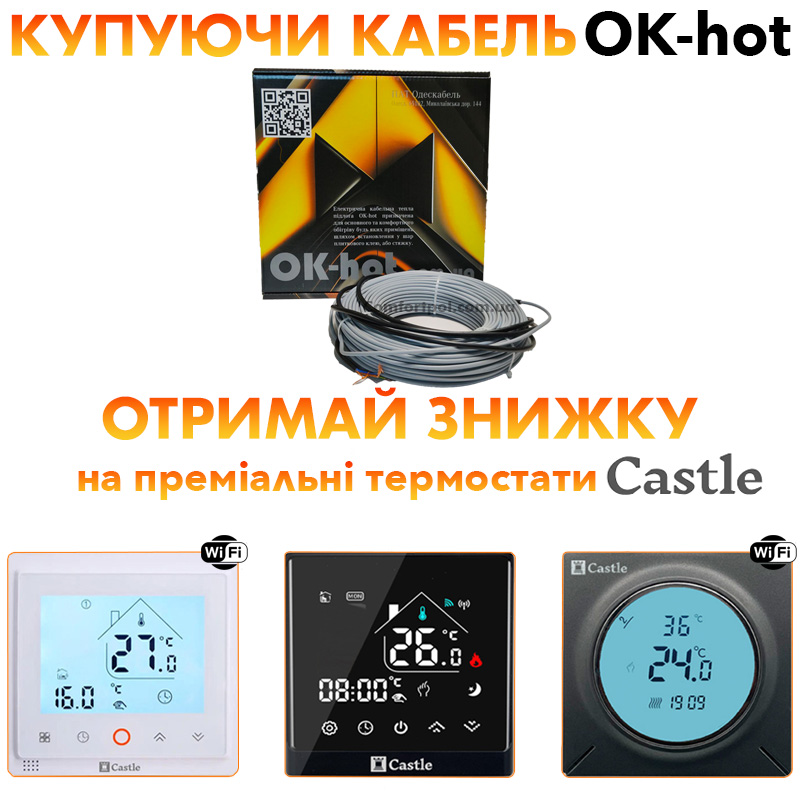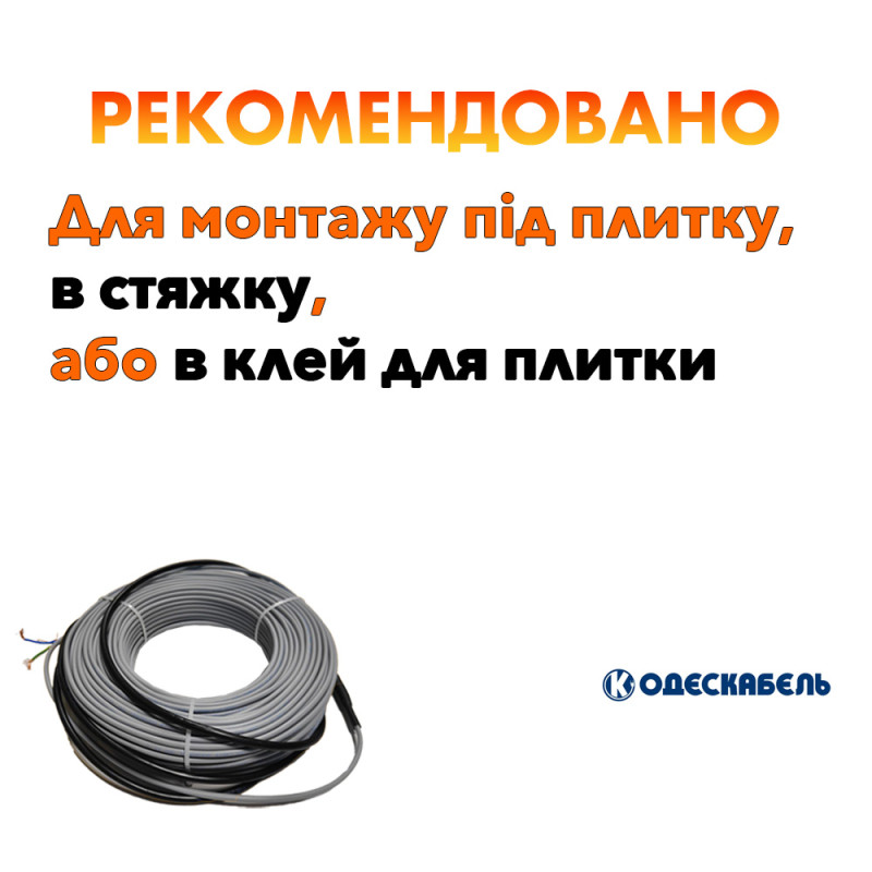 Теплый пол Одескабель OK-hot это двужильный нагревательный кабель, от Украинского производителя ПАО "Одескабель". Кабель Одескабель OK-hot 17 прекрасно подходит для устройства теплого пола, мощность двужильного кабеля OK-hot 17 Вт/м, кабель теплого пола OK-hot универсален его рекомендуется устанавливать как в бетонную стяжку так и под слой плиточного клея или ламинат, нагревательный кабель OK-hot, фиксируется на твердой поверхности с использованием оцинкованной монтажной ленты.