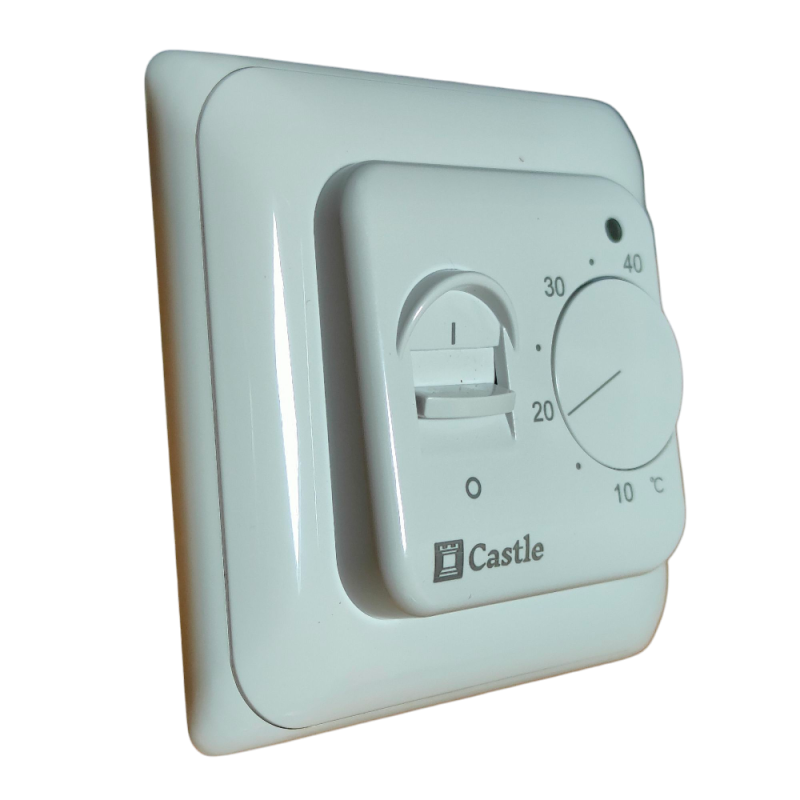 На передней части удобно расположены, ручки управления и механический выключатель. При отсутствии датчика терморегулятор работать не будет. Терморегулятор Castle 70.26, монтируется в стандартную монтажную коробку.