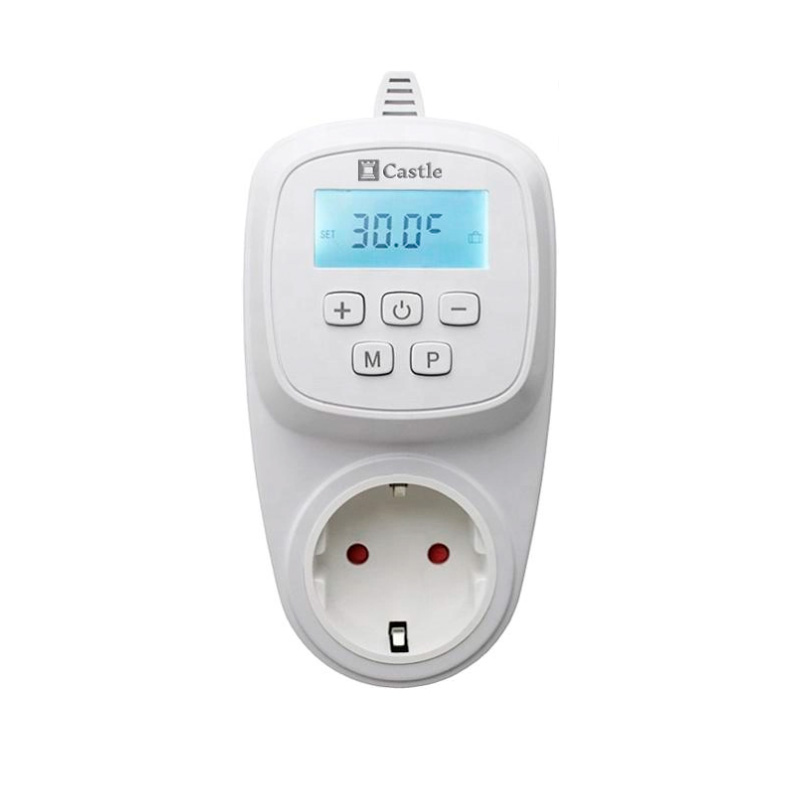 Термостат программируемый Castle АС209H оснащен встроенным датчиком температуры воздуха для управления обогревателем. Установка терморегулятора АС209H максимально простая, монтаж производится прямо в розетку, а устройство отопления подключается в розетку на передней панели термостата для конвекторов Кастл АС209H.