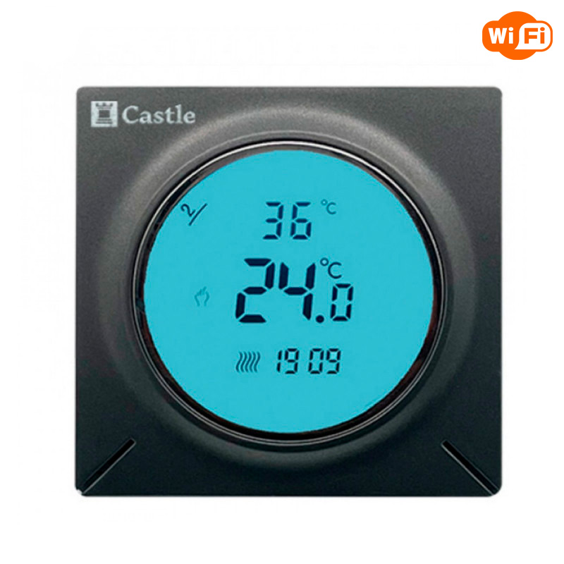 Терморегулятор электронный Castle АС829H предназначен для автоматического регулирования температуры (поддержания заданной пользователем температуры) в помещениях, оборудованных кабельными системами отопления «теплый пол». Рекомендован для установки с любыми системами электрического обогрева (резистивные кабели, маты, ИК пленки). При отсутствии датчика терморегулятор работать не будет. Терморегулятор АС829H монтируется в стандартную монтажную коробку. На передней части программатора Кастл АС829H расположен круглый большой дисплей со всей необходимой информацией о работе системы кабельного обогрева теплый пол. Термостат для теплого пола Catle AC829H поддерживает управление со смартфона через сеть Wi-FI.