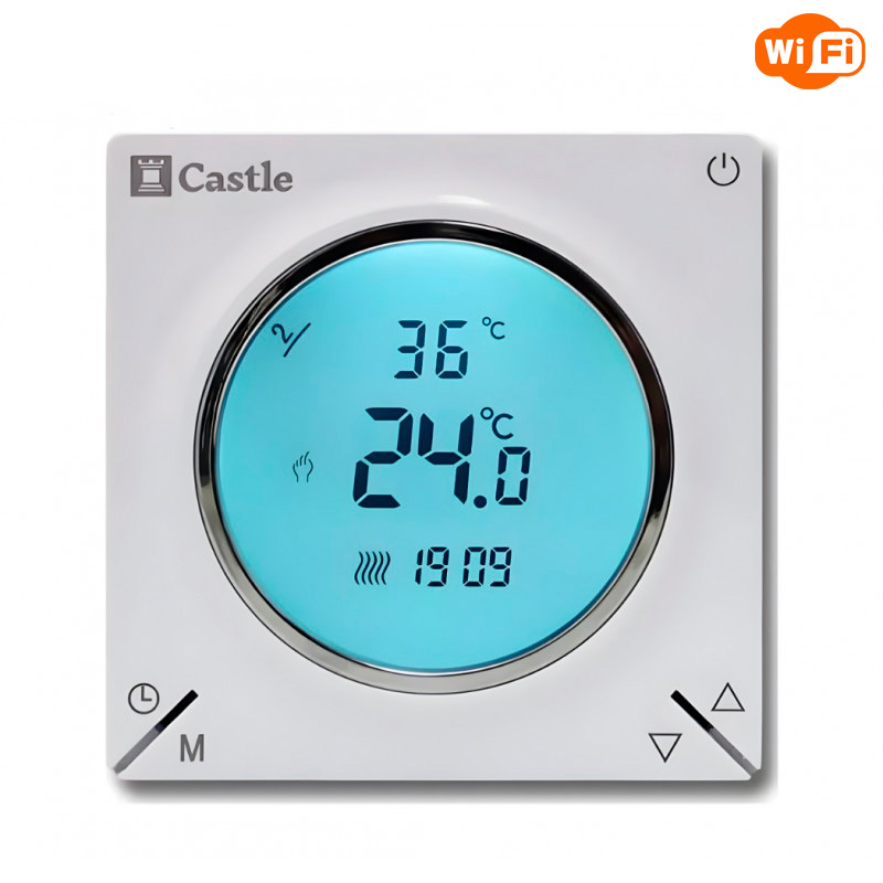 Терморегулятор электронный Castle АС829H предназначен для автоматического регулирования температуры (поддержания заданной пользователем температуры) в помещениях, оборудованных кабельными системами отопления «теплый пол». Рекомендован для установки с любыми системами электрического обогрева (резистивные кабели, маты, ИК пленки). При отсутствии датчика терморегулятор работать не будет. Терморегулятор АС829H монтируется в стандартную монтажную коробку. На передней части программатора Кастл АС829H расположен круглый большой дисплей со всей необходимой информацией о работе системы кабельного обогрева теплый пол. Термостат для теплого пола Catle AC829H поддерживает управление со смартфона через сеть Wi-FI.