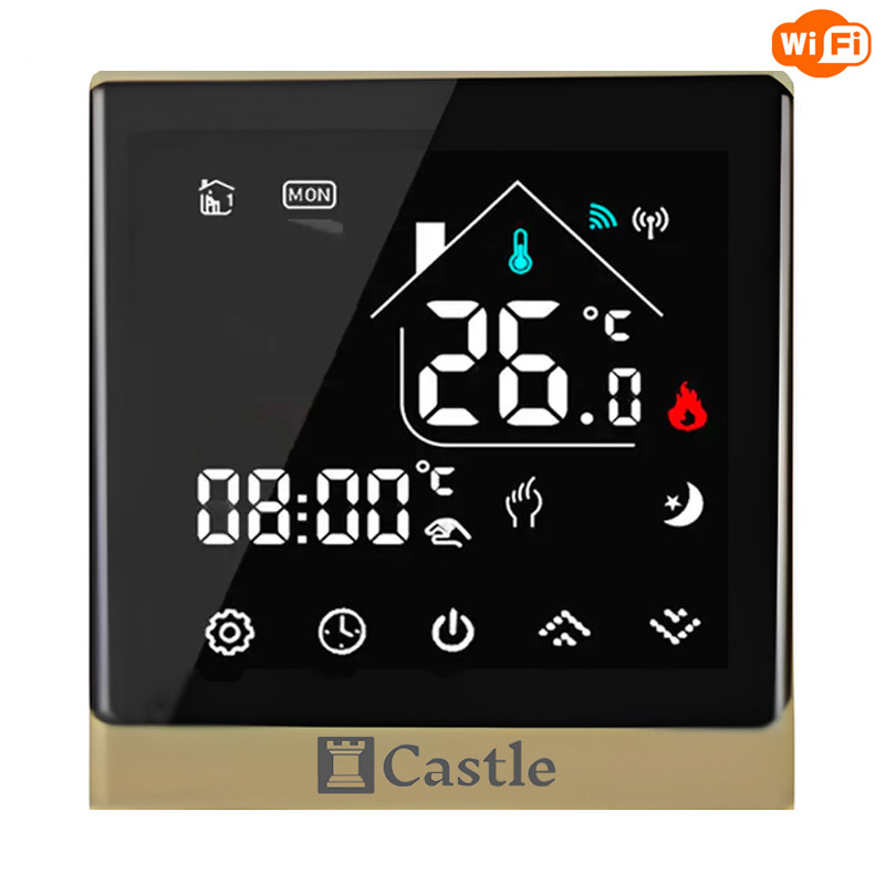 Терморегулятор электронный Castle АС8400H предназначен для автоматического регулирования температуры (поддержания заданной пользователем температуры) в помещениях, оборудованных кабельными системами отопления «теплый пол» имеет сенсорный дисплей управления термостатом производится с помощью пяти сенсорных кнопок на экране устройства.