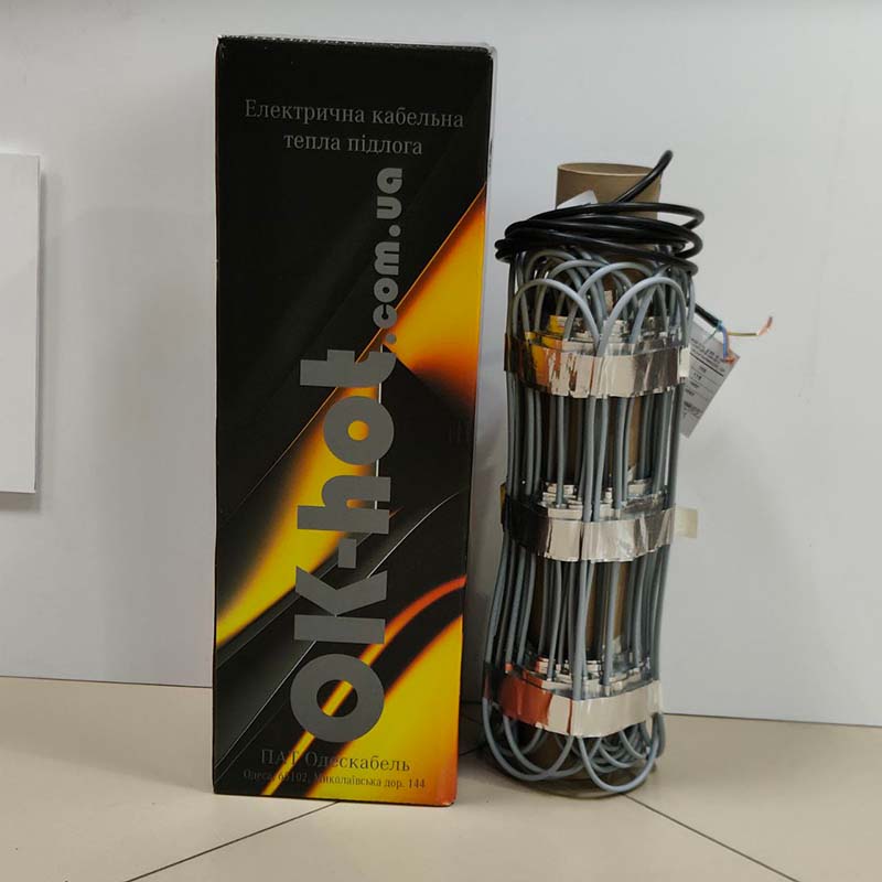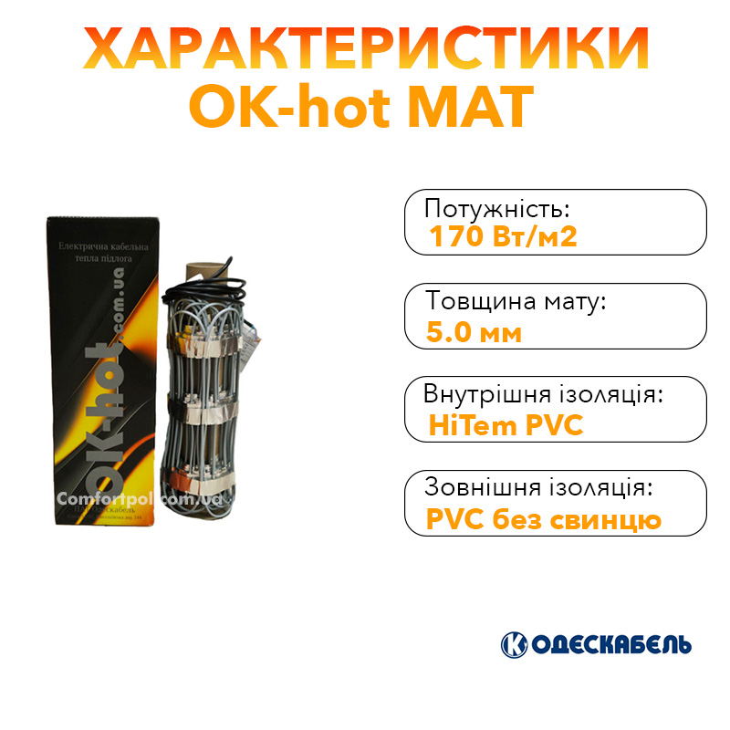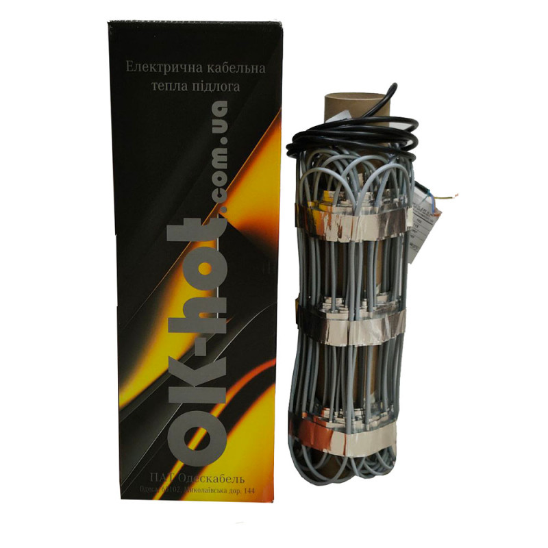 Конструкція мату складається з двожильного кабелю для теплої підлоги та алюмінієвої стрічки, сам гріючий кабель складається з внутрішньої HiTem PVC та зовнішньої PVC ізоляції, а також алюмінієвого екрану. Ізоляція нагрівального кабелю Одескабель OK-hot, не втрачає своїх властивостей при високій температурі жили, що гріє.