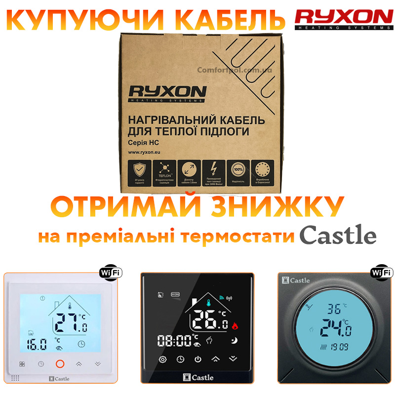 Продукти Ryxon є новинкою на ринку електроопалення в Україні. Наявність екрану та заземлювального обплетення біля кабелю дозволяє застосовувати опалювальну систему в приміщеннях з підвищеною вологістю (наприклад, ванні кімнати, сауни тощо).