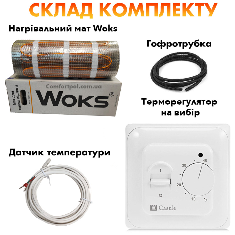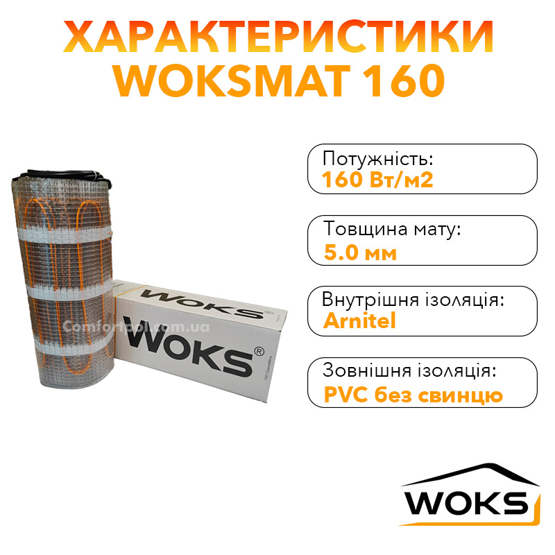 Теплий мат Woks складається з двожильного нагрівального кабелю, який надійно закріплений на сітці зі скловолокна з фіксованим кроком укладання 10 см. (160 Вт/м2) кабель має алюмінієвий екран, він підключається до заземлення, для запобігання наростанню напруги на зовнішній стороні теплого мату.