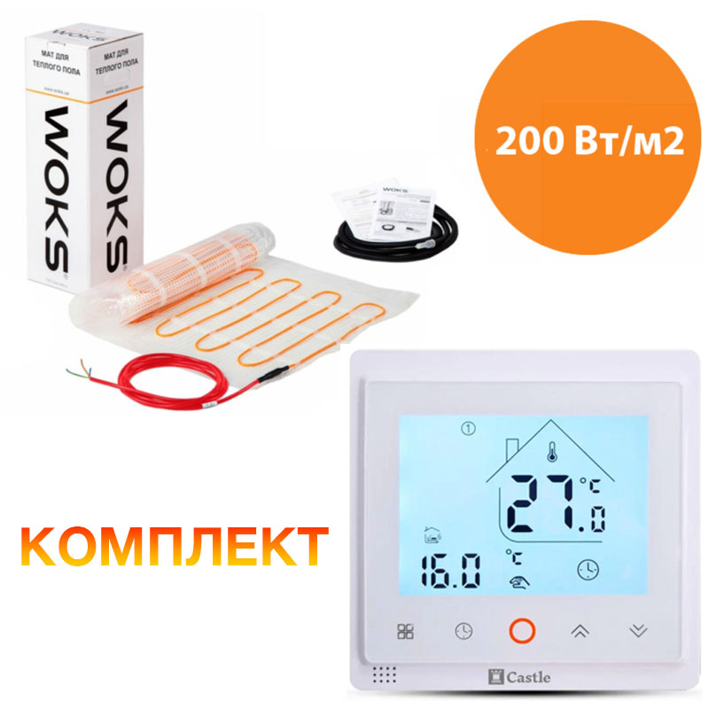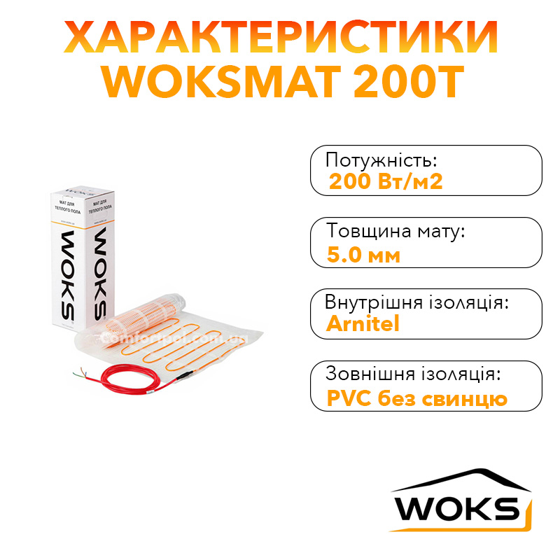 Теплий мат Woks складається з двожильного нагрівального кабелю, який надійно закріплений на сітці зі скловолокна з фіксованим кроком укладання. (200 Вт/м2) кабель має алюмінієвий екран, він підключається до заземлення, щоб запобігти наростанню напруги на зовнішній стороні теплого мату.