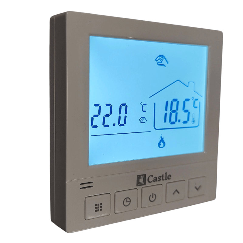 Терморегулятор електронний Castle АС819H призначений для автоматичного регулювання температури (підтримання заданої користувачем температури) у приміщеннях, обладнаних кабельними системами опалення «тепла підлога». Рекомендований для встановлення з будь-якими системами електричного обігріву (резистивні кабелі, мати, ІЧ плівки). За відсутності датчика терморегулятор не працюватиме. Терморегулятор АС819H монтується у стандартну монтажну коробку. На передній частині програматора Кастл АС819H розташований дисплей з усією необхідною інформацією про роботу системи кабельного обігріву тепла підлога,