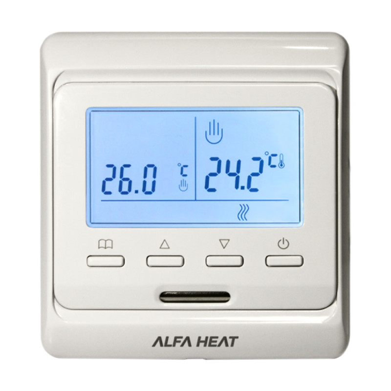 Терморегулятор електронний ALFA HEAT PRO призначений для автоматичного регулювання температури (підтримання заданої користувачем температури) у приміщеннях, обладнаних кабельними системами опалення «тепла підлога». Рекомендований для встановлення з будь-якими системами електричного обігріву (резистивні кабелі, мати, ІЧ плівки). За відсутності датчика терморегулятор не працюватиме. Терморегулятор ALFA HEAT PRO монтується у стандартну монтажну коробку. На передній частині програматора Кастл АС819H розташований дисплей з усією необхідною інформацією про роботу системи кабельного обігріву тепла підлога,