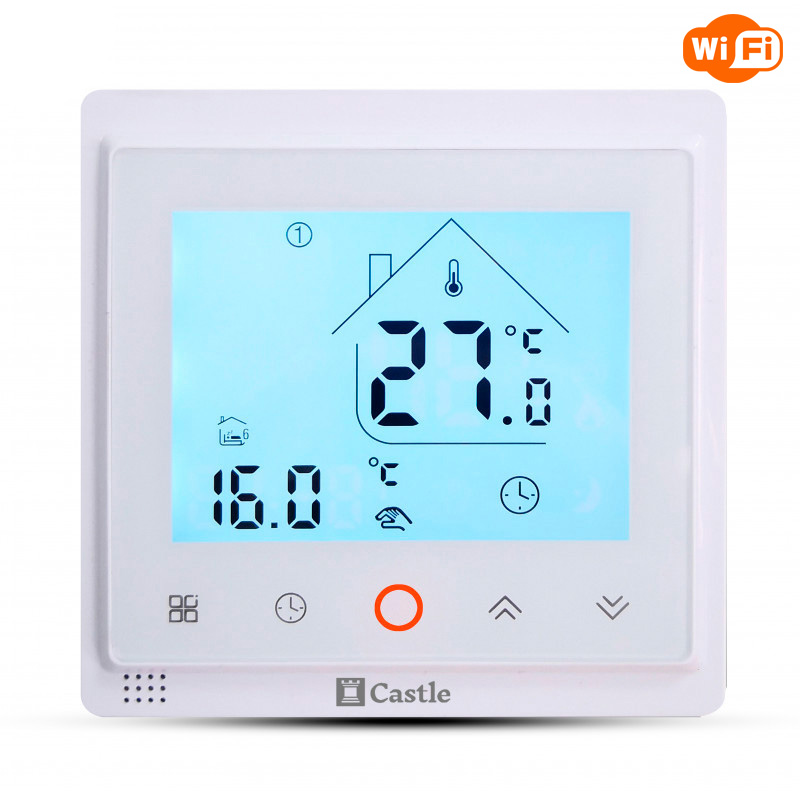 Термостат Кастл AC-603Н, виробляється в Китаї з якісного стійкого до ультрафіолету пластику, на лицьовій частині терморегулятора, розташований сенсорний екран, з усією необхідною інформацією користувача. Є повне керування термостатом через мережі WiFi, зі смартфона або браузера персонального комп'ютера. Завдяки точному настроюванню індивідуального розкладу роботи за допомогою термостата Castle AC-603Н WiFi, Вам вдасться суттєво заощадити кошти на опаленні. Термостат Кастл AC-603Н, має функцію самодіагностики і неодмінно повідомить Вас про можливі несправності в системі опалення.